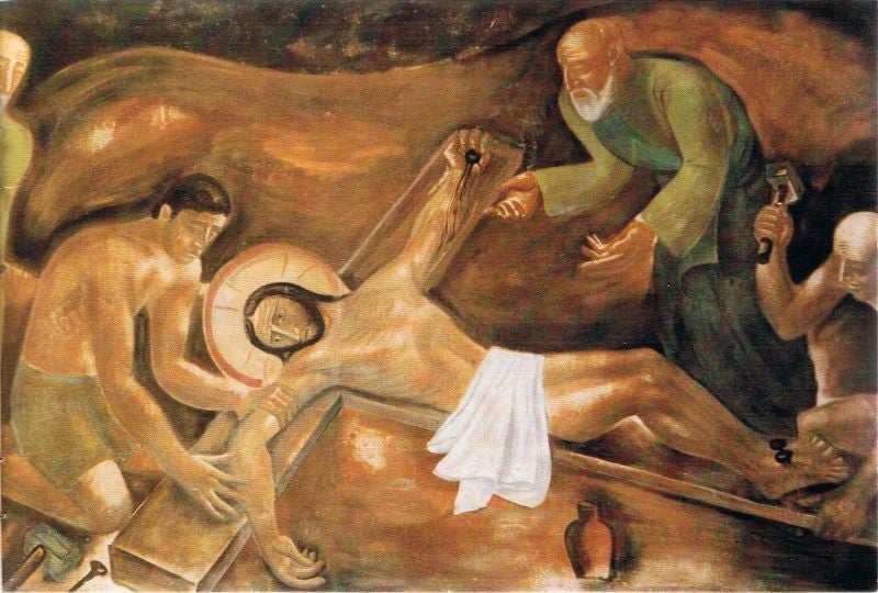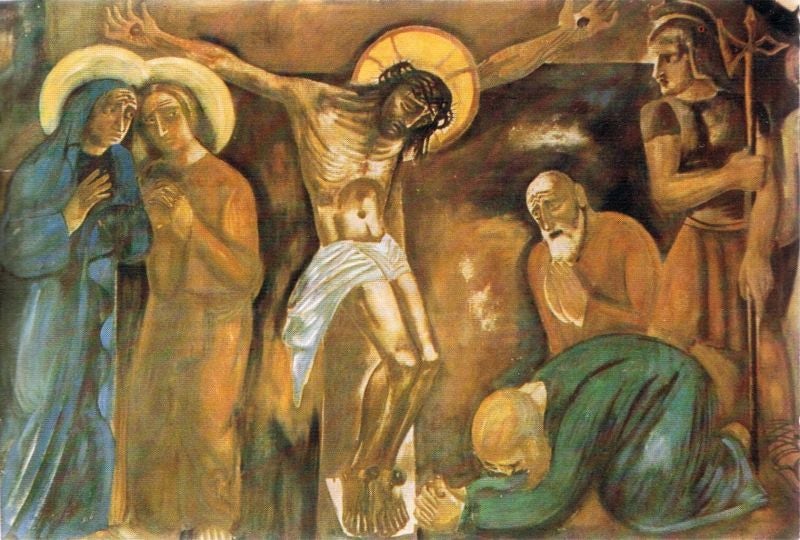 Aan het kruis genageld, onbeweeglijk in die vreselijke houding, roept Jezus de Vader aan (vgl. Mc.15,34; Mt.27,46; Lc.23,46). Al Zijn aanroepingen getuigen ervan dat Hij één is met Hem. 'Ik en de Vader, Wij zijn één' (Joh.10, 30); 'Wie Mij ziet, ziet de Vader' (Joh.14,9); 'Mijn Vader is tot op de dag van vandaag voortdurend aan het werk, en ook Ik houd niet op met werken' (Joh.5,17). Zo zien we nu het verhevenste, het subliemste werken van de Zoon in eenheid met de Vader. Ja, in eenheid, in de diepste eenheid, juist wanneer Hij uitroept: 'Eloï, Eloï, lama sabaktani' — 'Mijn God, mijn God, waarom hebt Gij mij verlaten?' (Mc.15,34; Mt.27,46). Dit werken wordt uitgedrukt door de verticale lijn van het Lichaam dat langs de rechtopstaande balk van het kruis gespannen is en door de horizontale lijn van de armen die langs de dwarsbalk zijn gespannen. De mens die naar deze armen kijkt, kan denken dat zij met kracht de mens en de wereld omarmen. Ziehier de mens. Ziehier God zelf. 'Door Hem... hebben wij het leven, het bewegen en het zijn' (Hand.17,28). Door Hem: door die langs de dwarsbalk van het kruis gespannen armen. Het mysterie van de verlossing.