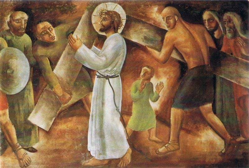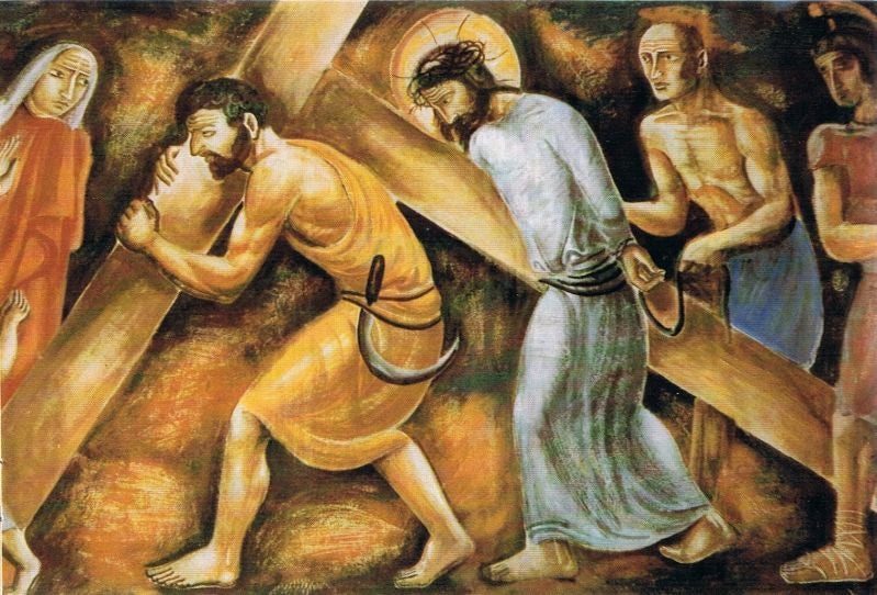 Toen ze de stad uitgingen, ontmoetten ze een Cyreneeër, Simon genaamd en vorderden hem tot het dragen van Jezus' kruis. (Mt 27,32)
