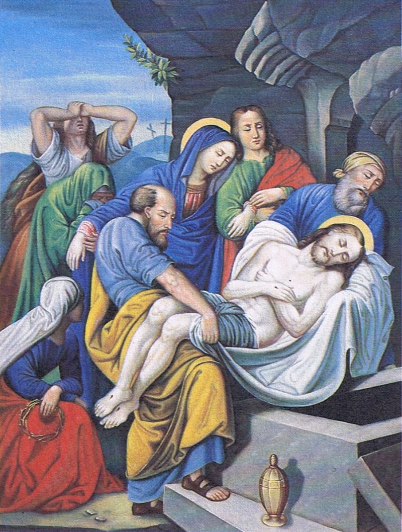 14e Statie: Jezus wordt in het graf gelegd.